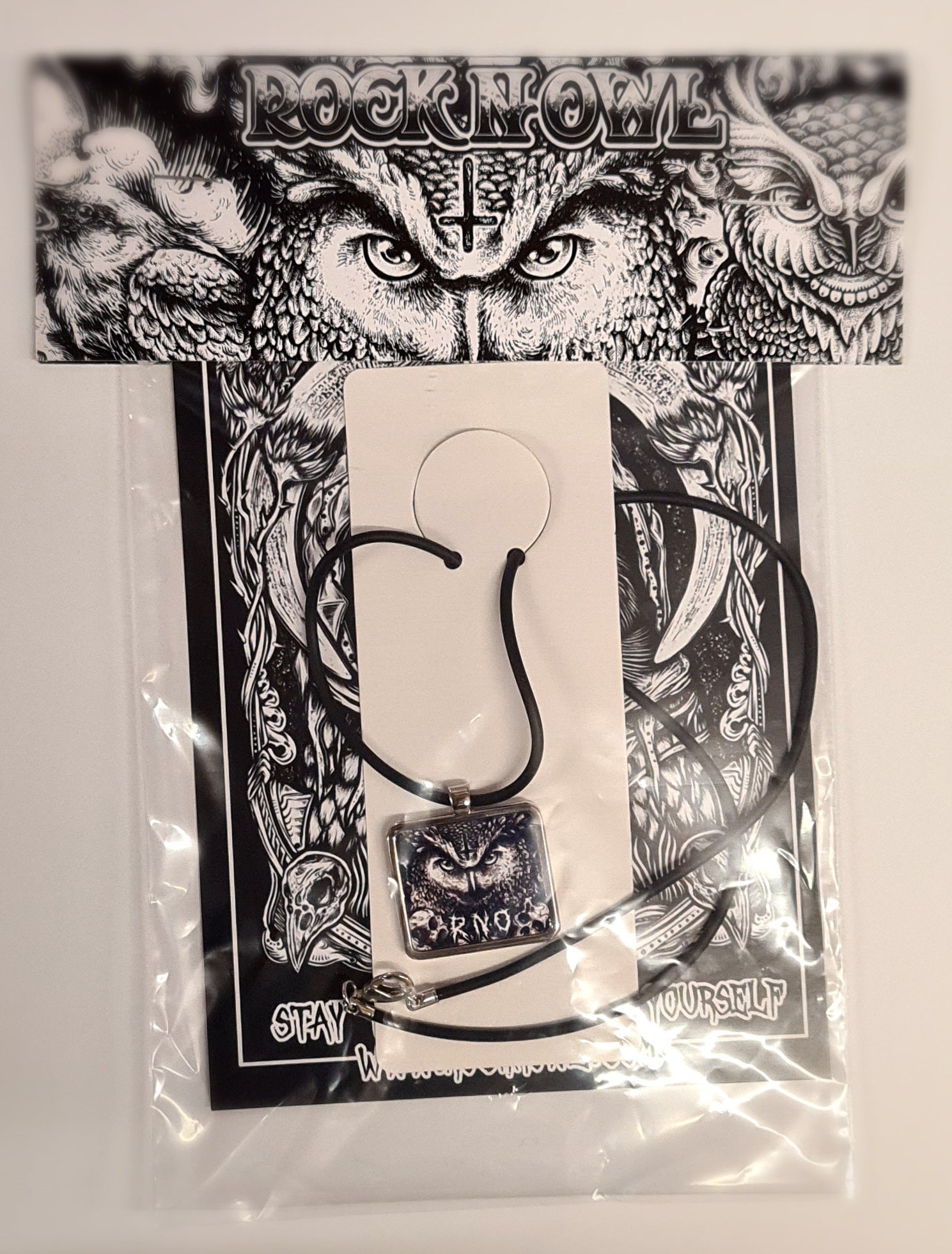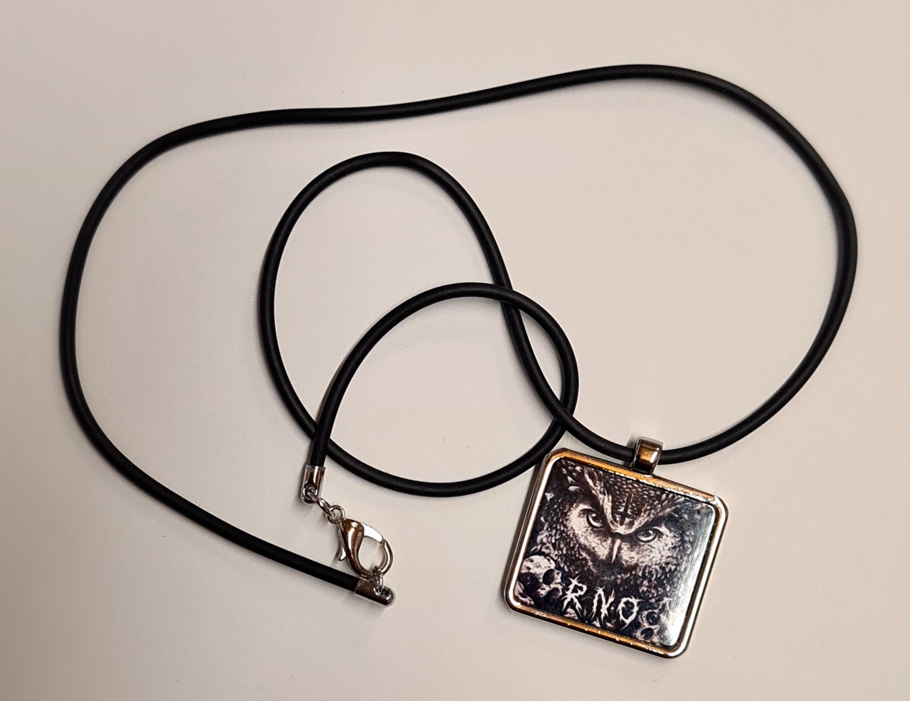 Der rechteckige Anhänger mit Kautschukband mit unserem D-Owl Motiv.