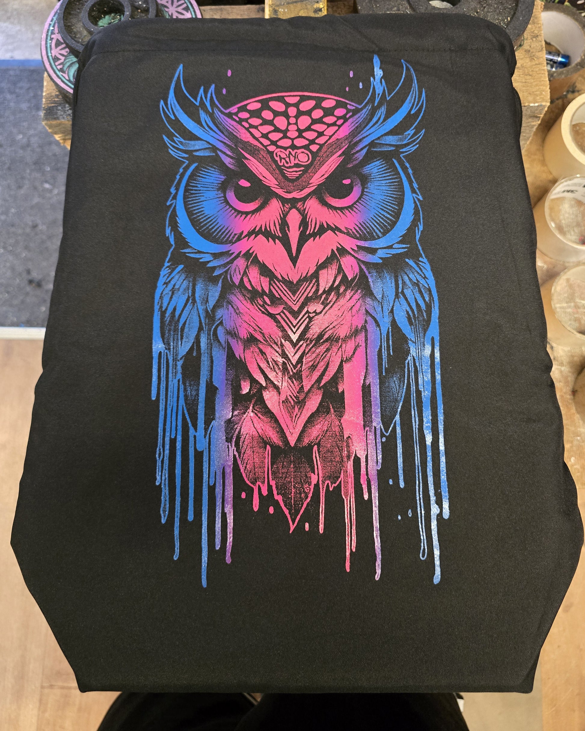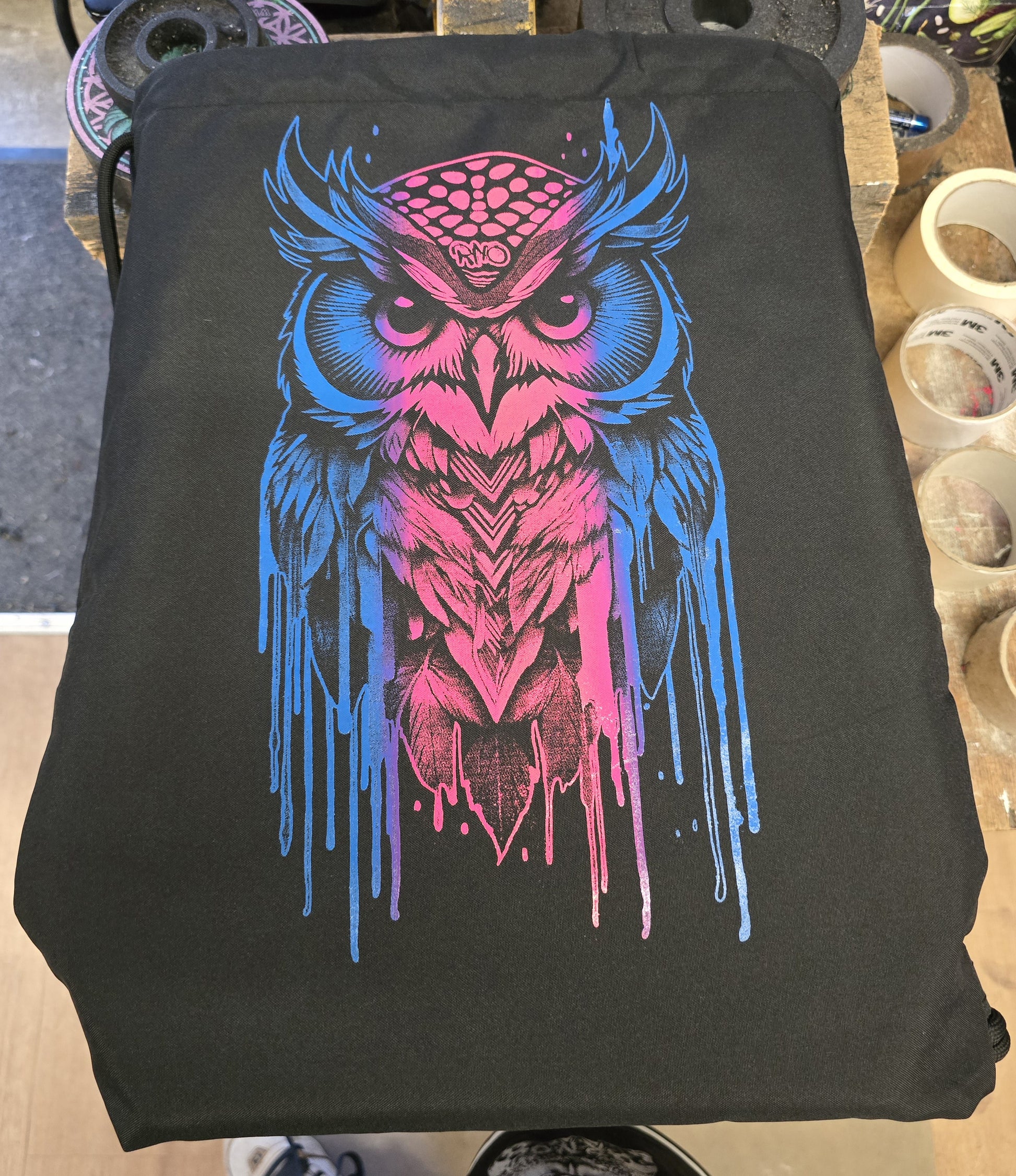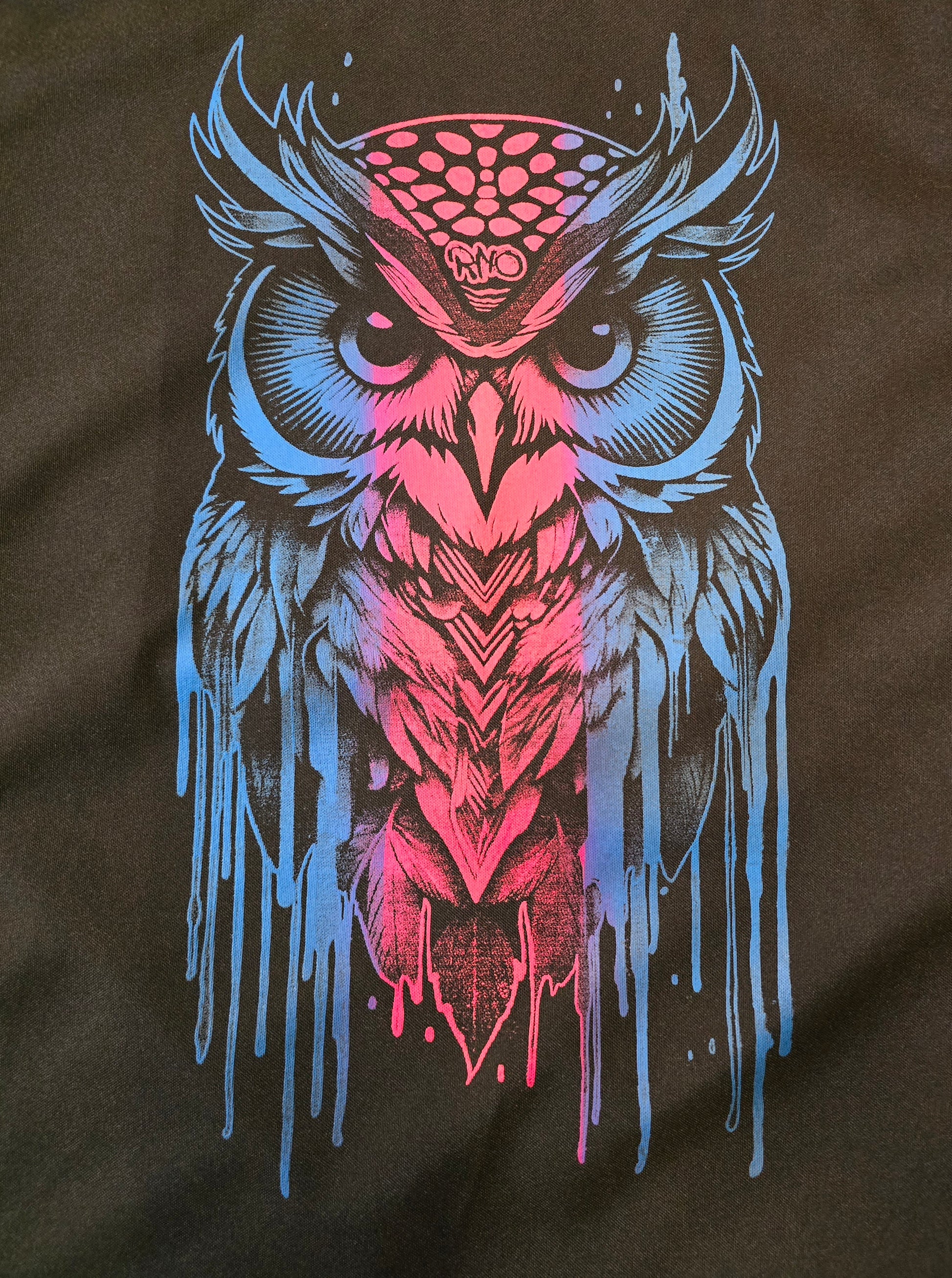 Die praktische RNO-GROWLITI recycelte Gymsac in schwarz mit Siebdruck neonblau und neonmagenta.