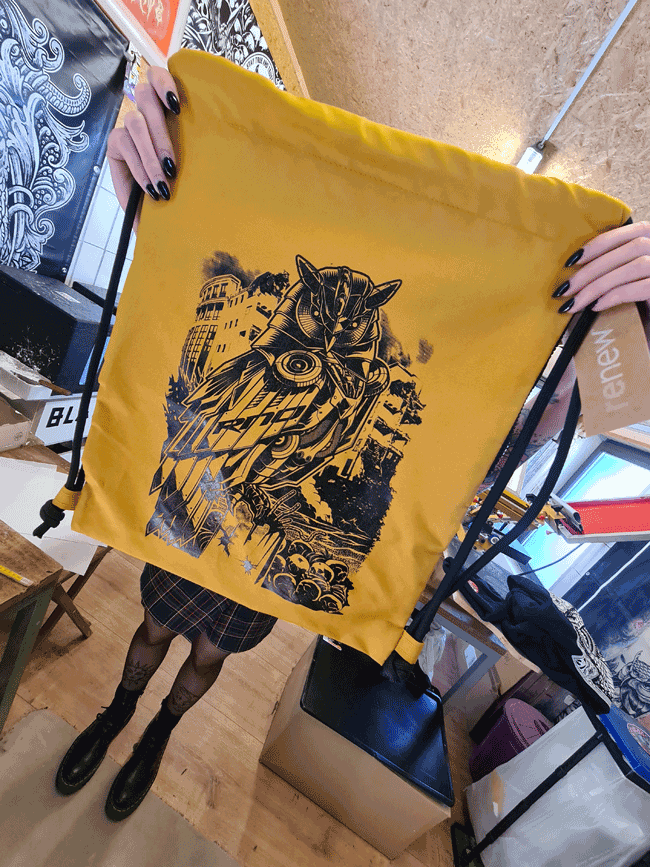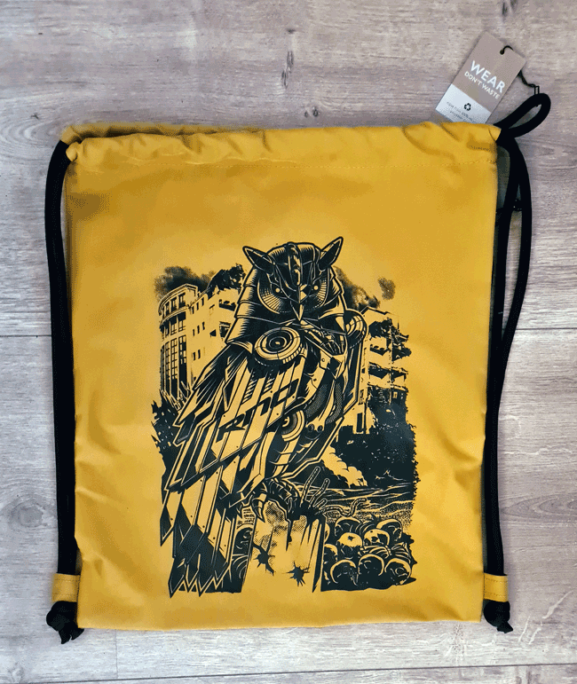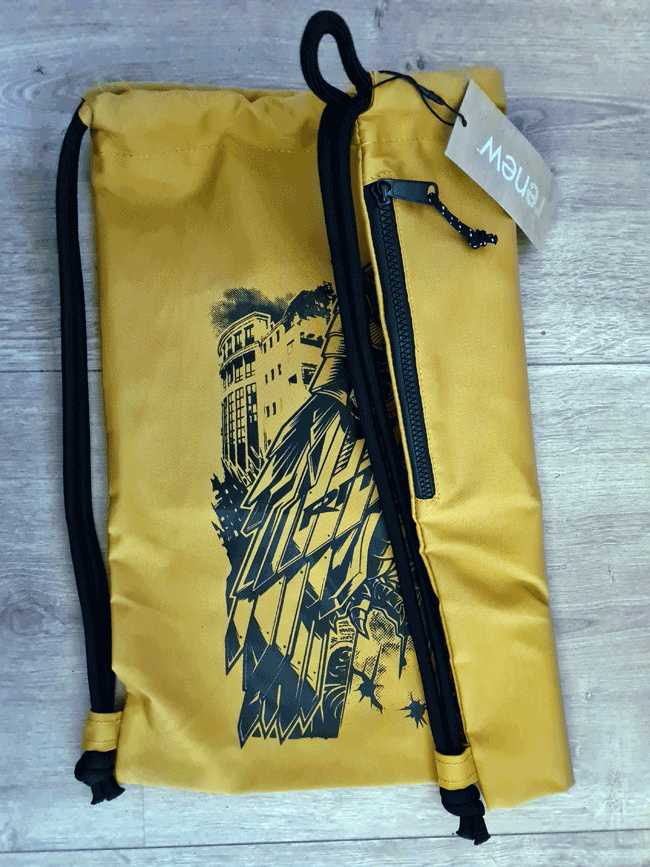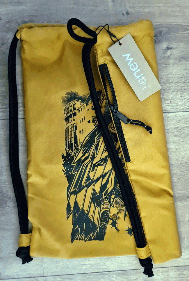 Die praktische RNO-TRANSFOWL recycelte Gymsac in senfgelb mit Siebdruck schwarz