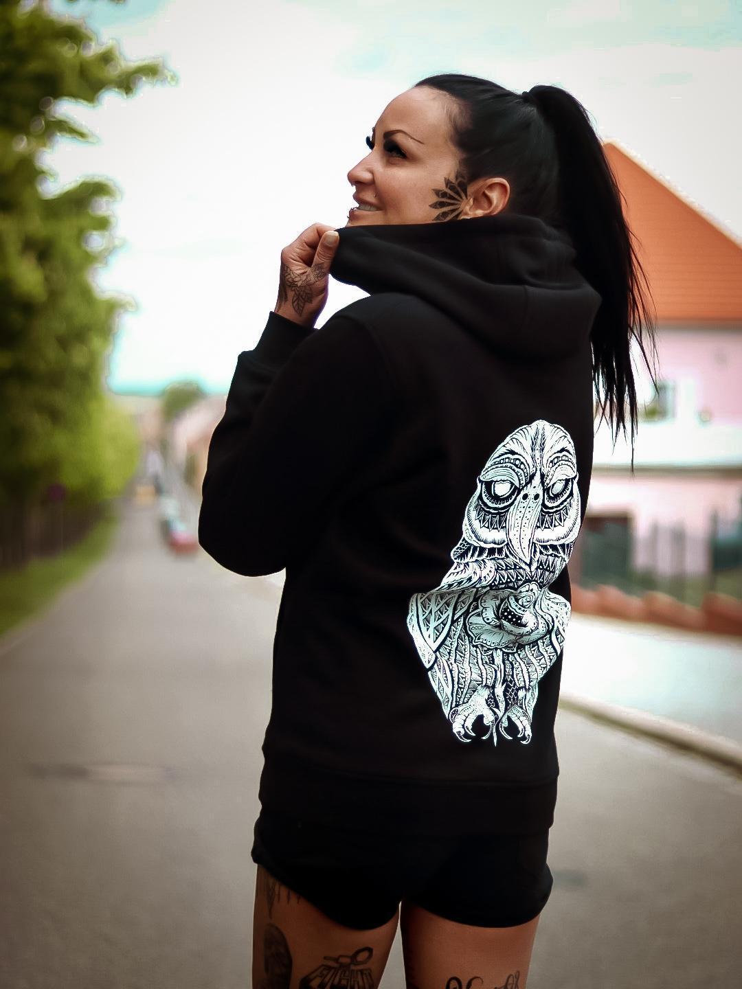 Unser S-OWL Design als Rückenprint. Vorne ist der Hoodie auf Brusthöhe mit dem Design ROSE ALONE bedruckt.