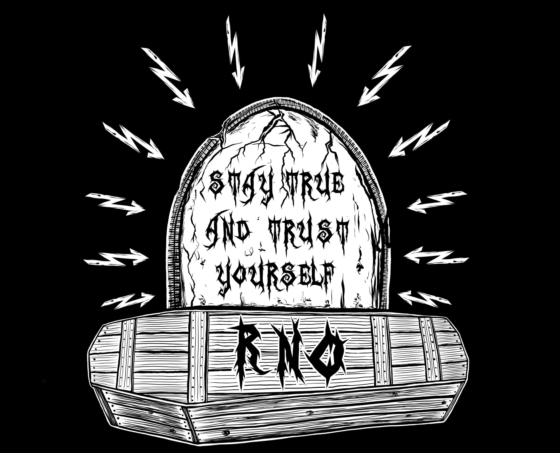Vorne sieht man den Sarg geschlossen und dahinter einen Grabstein mit unserem "STAY TRUE AND TRUST YOURSELF" Slogan . Um den Stein sind jede Menge Blitze.