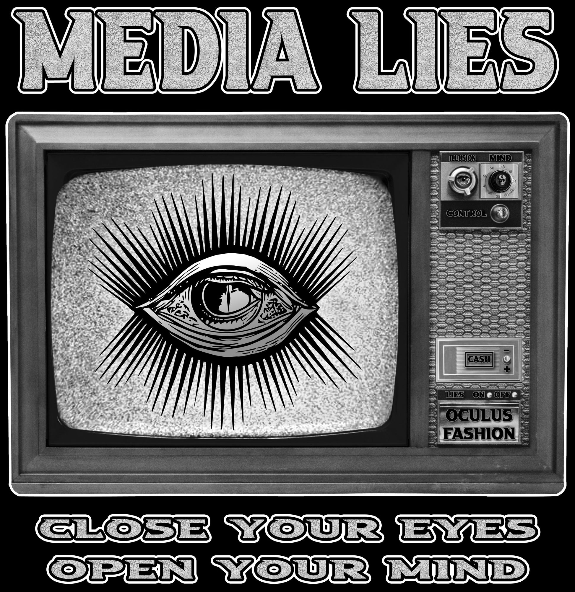 Backprint "MEDIA LIES"