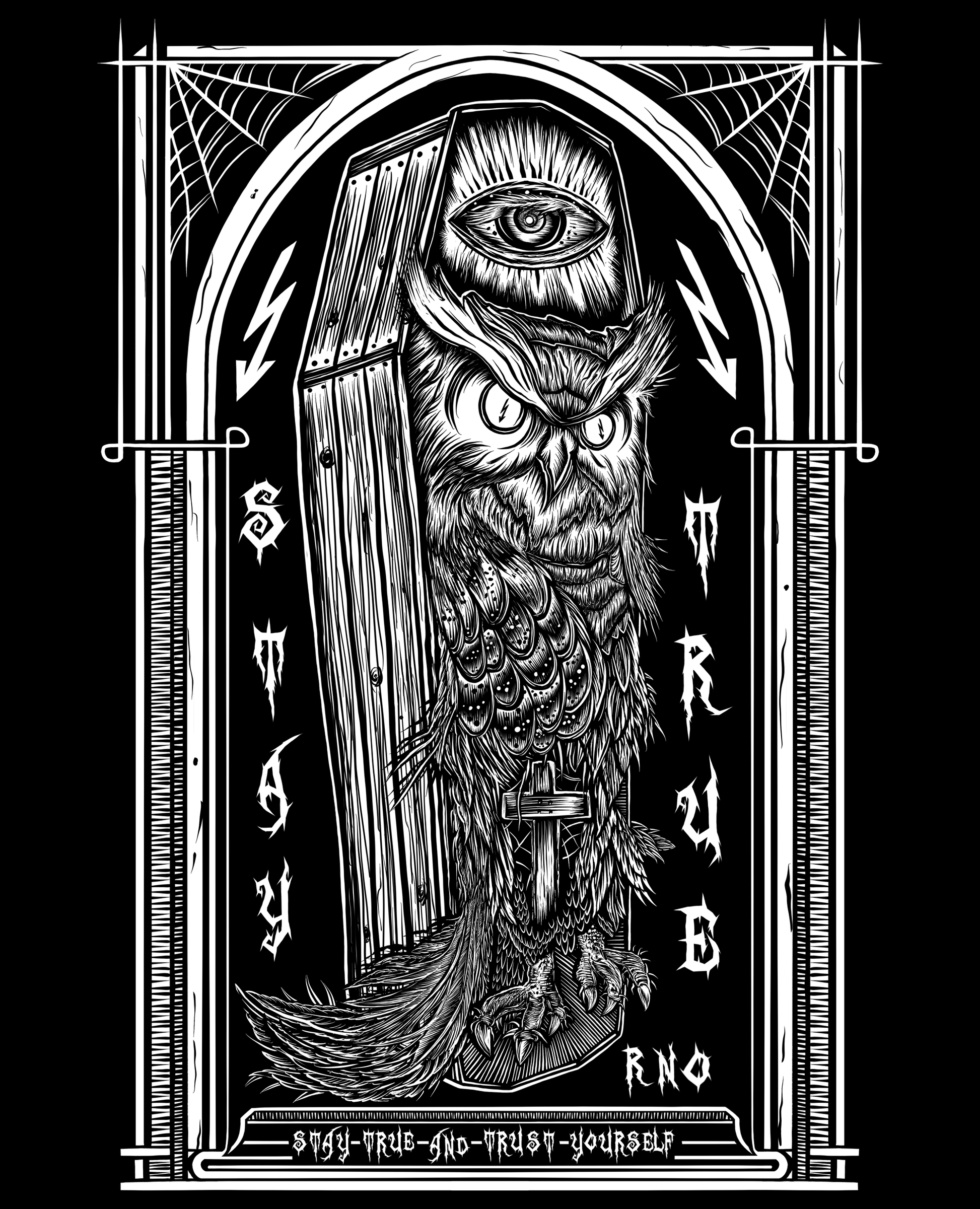 Vorne sieht man den Sarg geschlossen und dahinter einen Grabstein mit unserem "STAY TRUE AND TRUST YOURSELF" Slogan . Um den Stein sind jede Menge Blitze.