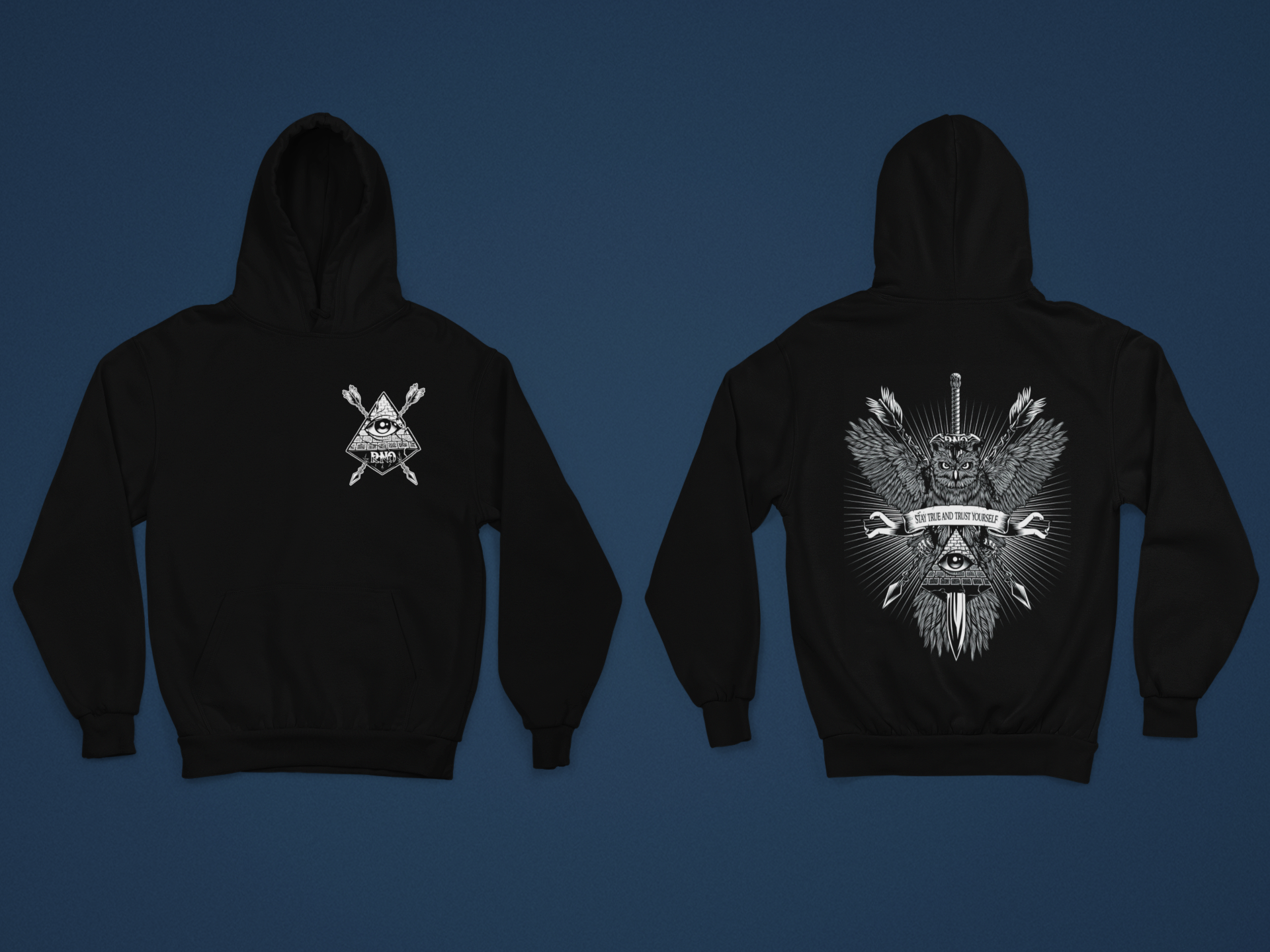 Das Swordowl Design beinhaltet wieder einige Tattoo Elemente. Ein Schwert durch den Kopf der Eule. Eine Banderole mit unserem Statement Stay True and Trust Yourself. Zwei Pfeile durchbohren die Owl von oben bis unten und jede Menge Sonnenstrahlen füllen den Hintergrund aus. Am Knauf des Swords steht in großen Lettern unser RNO