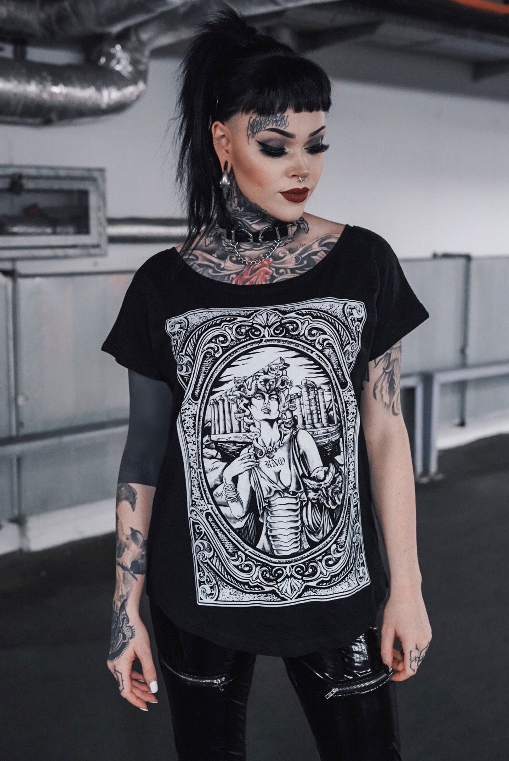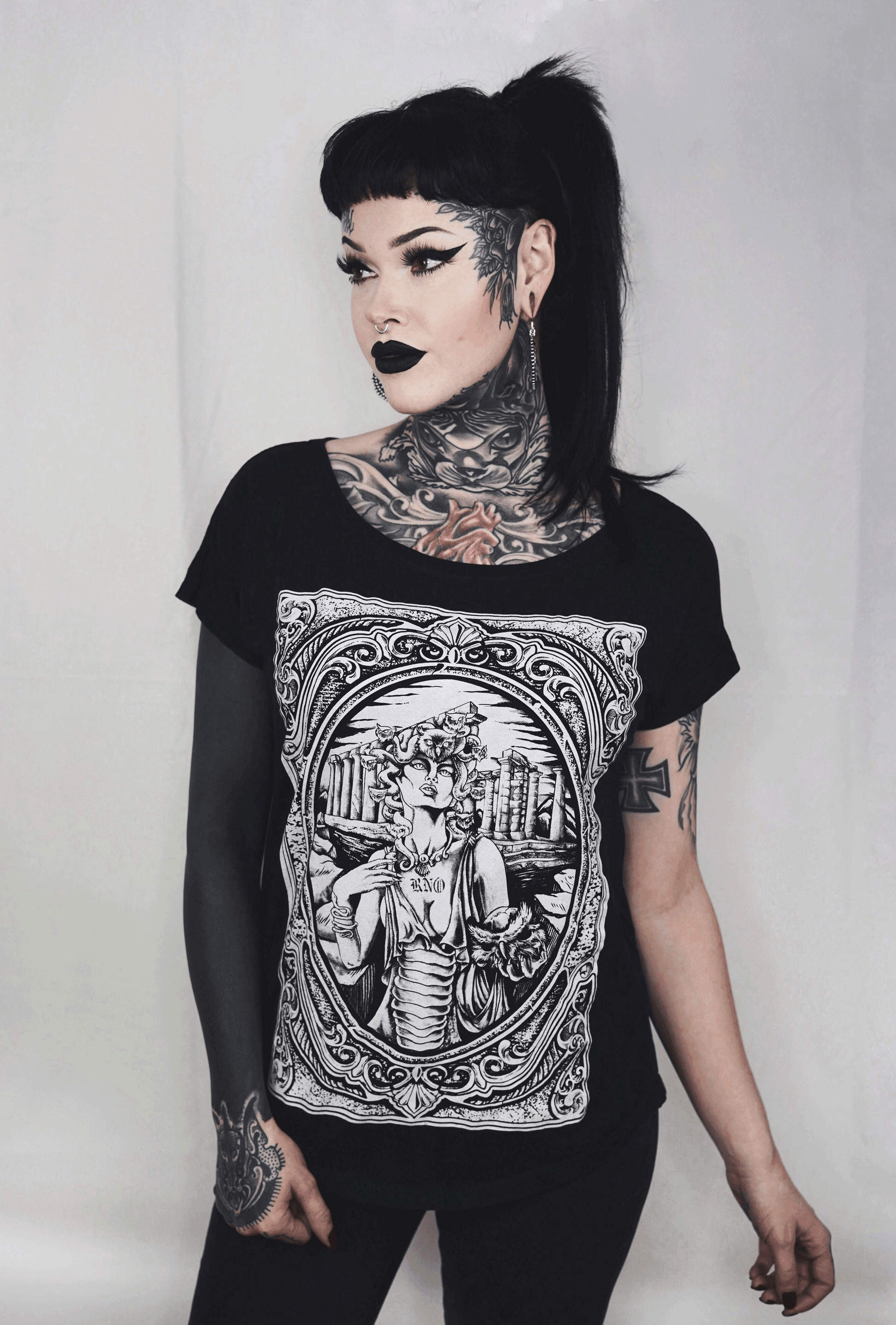 Meduussaa mit Eulen als Schlangen am Kopf, einen Eulenschädel in der Hand und das gesamte Design in einen Spiegel gepackt.