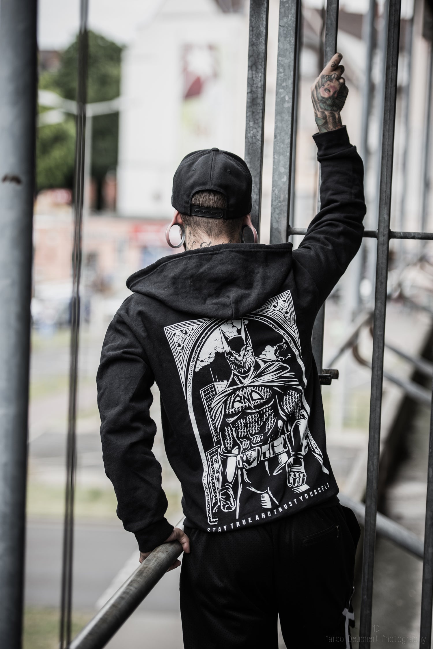 Unsere Kapuzenjacke mit dem Comichelden der Nacht!!! Unsere Eule kämpft für die Gerechtigkeit!!! Schickes RNO Design als Rückenprint. Vorne ist der Zipper mit unserem Feather Logo bedruckt.