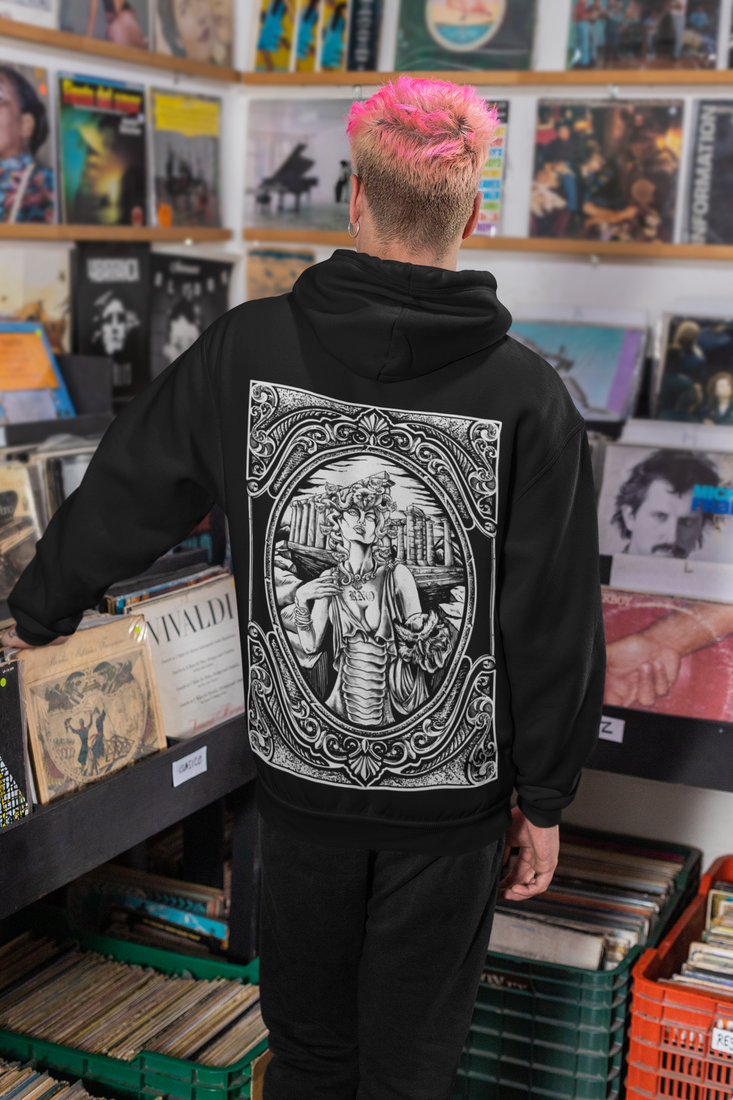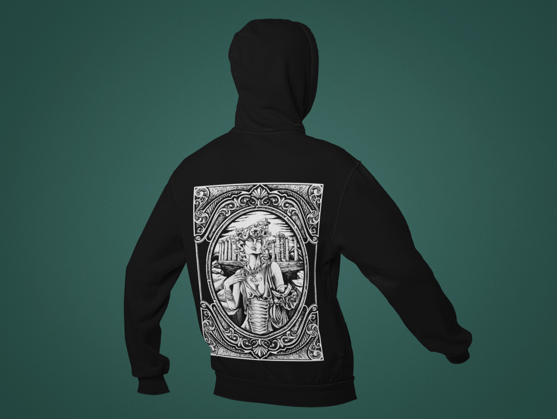 Meduussaa mit Eulen als Schlangen am Kopf, einen Eulenschädel in der Hand und das gesamte Design in einen Spiegel gepackt.