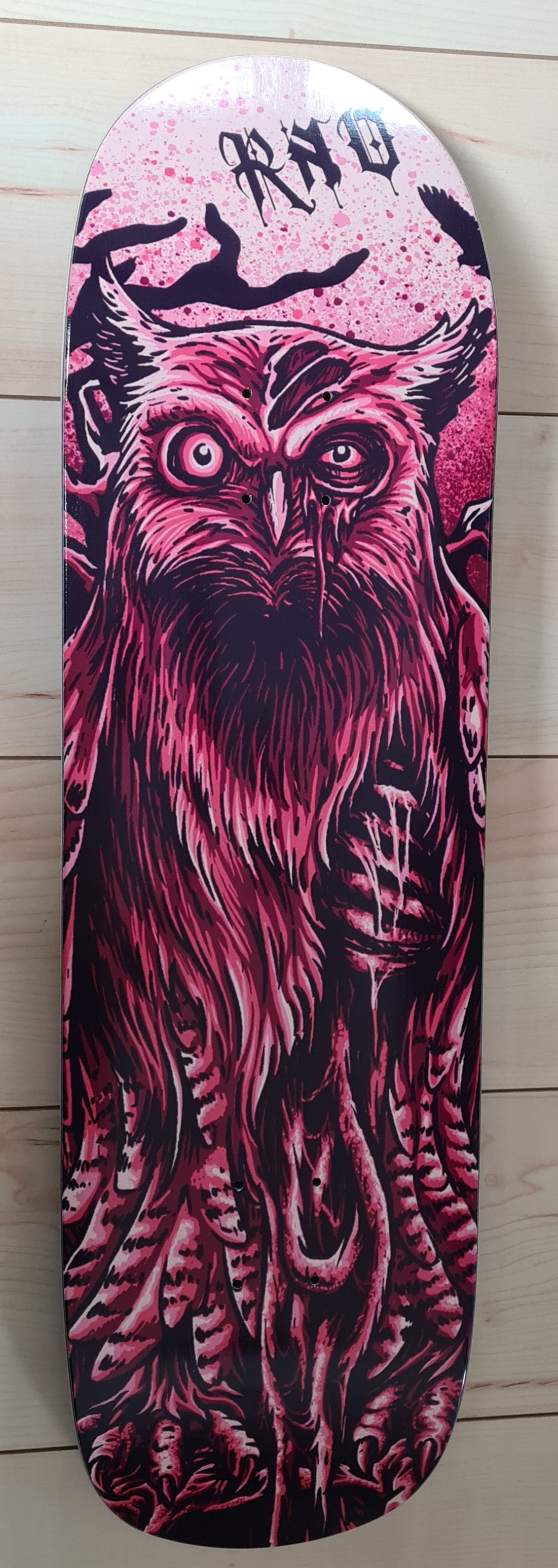 Unsere ZOMBIE-OWL auf einem Skateboard-Deck. Das Design ziert das gesamte Board. Unsere Zombieeule in bunt auf einem schönem breitem Board.