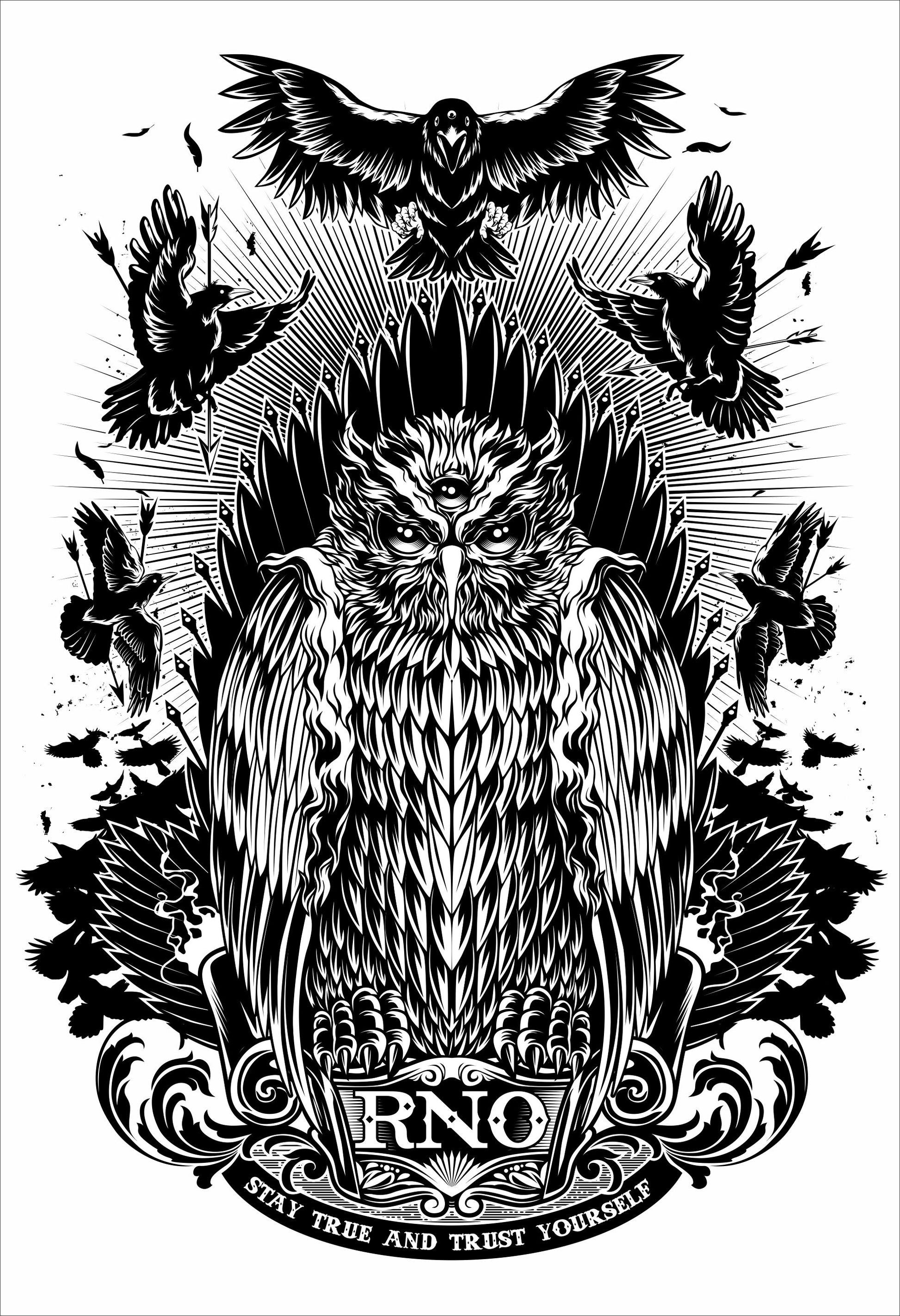 Unsere finstere Eule schön sitzend auf dem berühmten Königsstuhl. Zudem jede Menge umherfliegende Krähen. Oder ist das sogar ein dreiäugiger Rabe? Schönes Shirtdesign für alle Eulenfreunde der 7 Königreiche.