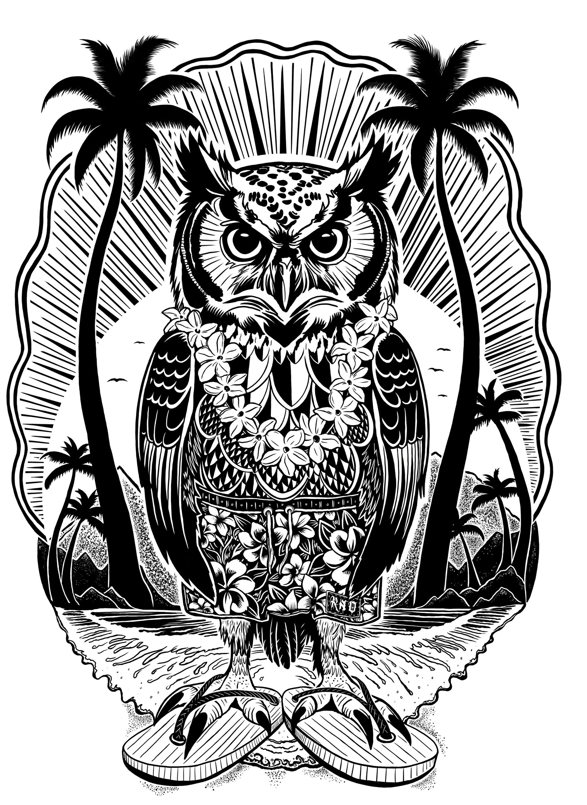 Eine coole Eule mit Flip Flops am Strand unter Palmen, dazu ne schicke RNO-Badeshort und Hawaikette.