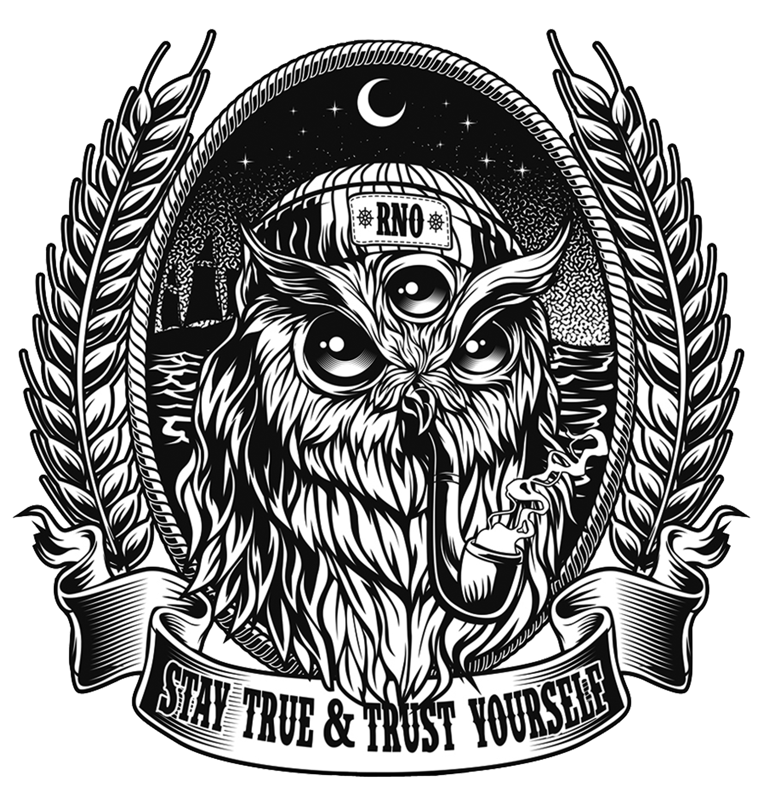 Nach unserem Anchor Shirt dachten wir die Liebe zur See benötigt noch ein weiteres Design. Sagt Hallo zu Sailorowl. Unsere Seemannseule schön mit RNO ROCKNOWL BEANIE am Kopf und einer Pfeife am Mund. Wie es sich für einen Seemann gehört. Seemannstau, Wellen und ein Schiff im Hintergrund darf auch nicht fehlen. Wer auf Motive aus dem Norden oder der Tattooszene steht der braucht dieses tolle Shirt. Natürlich darf da unser Claim "Stay True And Trust Yourself" als Banderole nicht fehlen.
