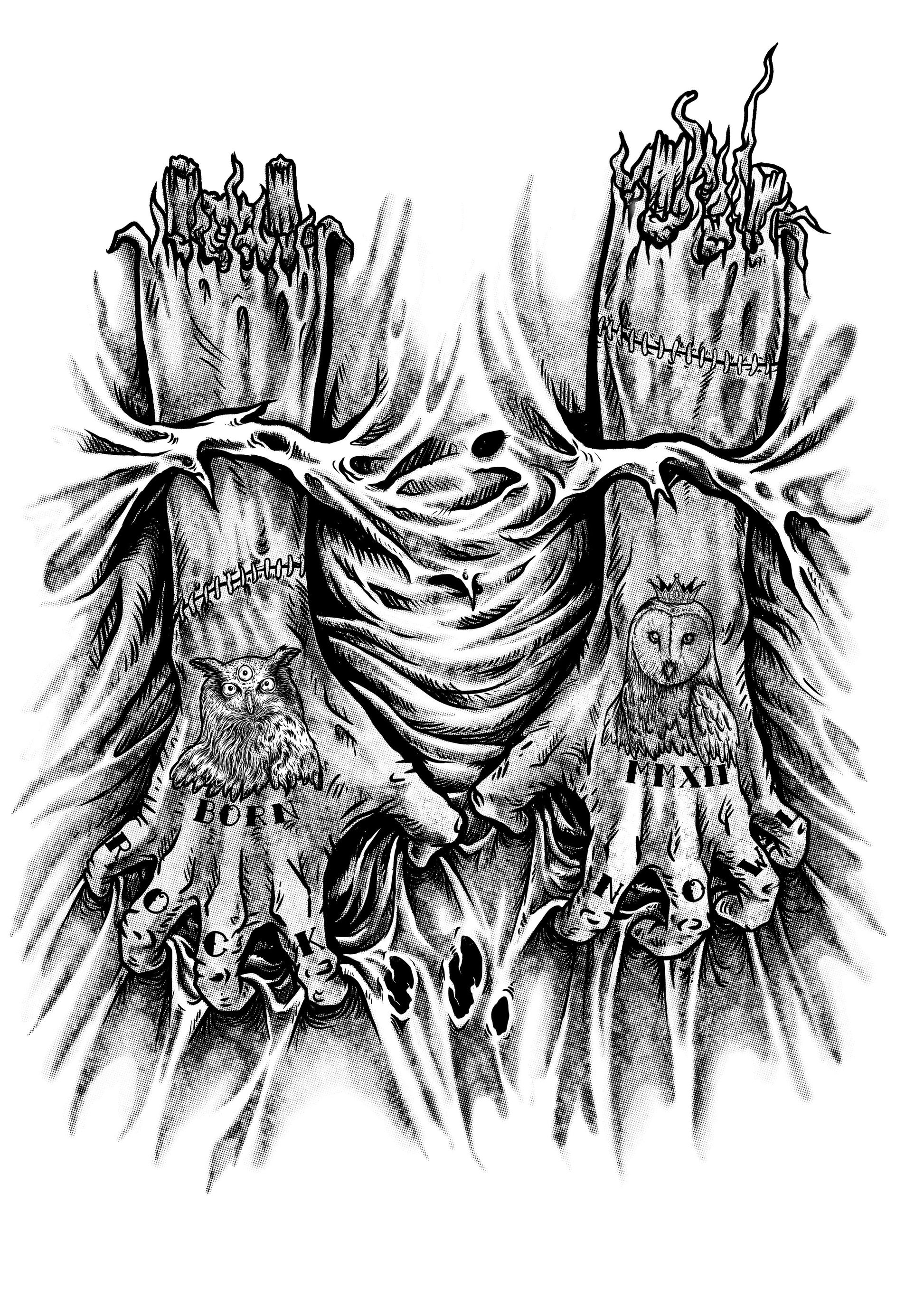 Unser TATTOO-ZOMBIE-HÄNDE T-Shirt für Ladies gibt es als graues Damenshirt. Die Handrücken sind mit zwei schönen Eulen Motiven tättoowiert.